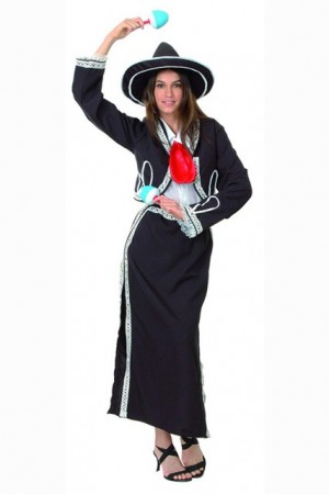 Déguisement de mexicaine pour femme qui se compose : d'une robe noir liseré argent, chemisier blanc, avec la veste noir en harmonie avec la jupe, et le chapeau. Ce costume est conçu pour les carnavals et les soirées déguisées.