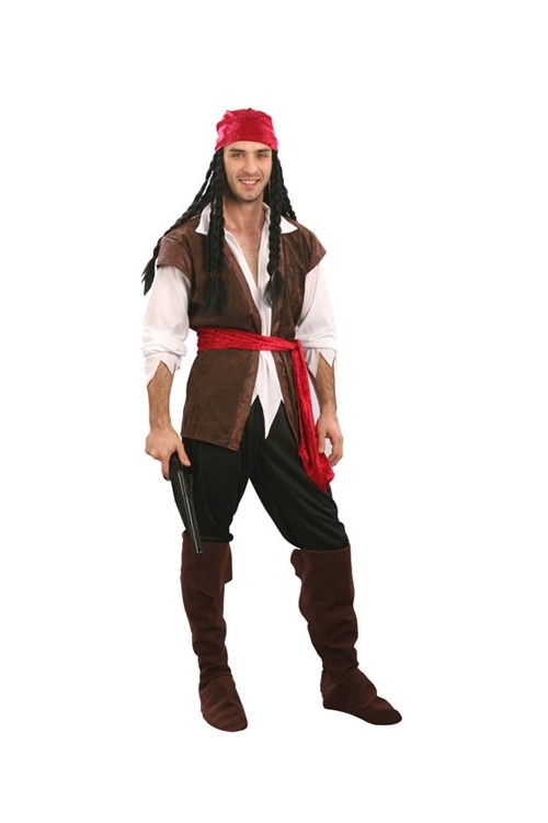 Un magnfique costume de pirate, composé: d'un corsaire marron, une tunique blanche en finition pointue, veste marron sans manche, sur-bottes marrons et foulard rouge. Ce costume sera parfait pour les carnavals.