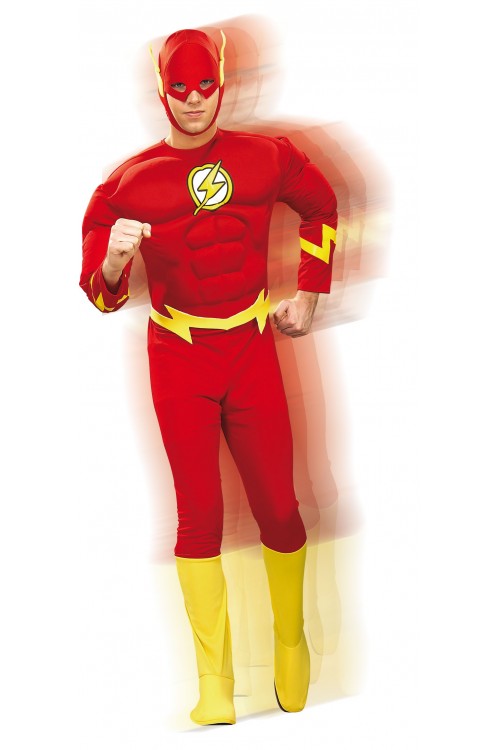 Le déguisement de luxe Flash imite à merveille la tenue de ce super héros. Le costume est composée d’une combinaison rouge vif. Elle dessine des muscles pectoraux, abdominaux, ainsi que les muscles des bras. La combinaison comporte le célèbre emblème de Flash, cousu sur la poitrine. Les manches sont ornées de deux éclairs jaunes. La ceinture est composé d’une ligne jaune, qui représente la forme d’un éclair. Le costume comprend une paire de bottes jaunes, qui montent jusqu’à mi mollet. Il comprend également un masque rouge. Ce masque vient recouvrir le haut du crane, et laisse le nez et la bouche à découvert. Il est orné de deux éclairs jaunes, de chaque côté.