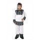 Le déguisement Esquimau Enfant comprend un long pantalon et une tunique droite à capuche. Le pantalon est blanc, complété d'une large bande à motifs au niveau des pieds. Ces motifs sont des rayures verticales dans les tons bleus, verts et gris. La tunique, à manches longues bien sûr, est également blanche et reprend les bandes de rayures, au niveau des mains et de la poitrine, afin de mettre l'enfant en valeur. Enfin, pour se protéger du froid glacial, l'épaisse et chaude capuche blanche se noue sous le cou de l'enfant, grâce à un cordon bleu foncé.