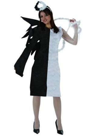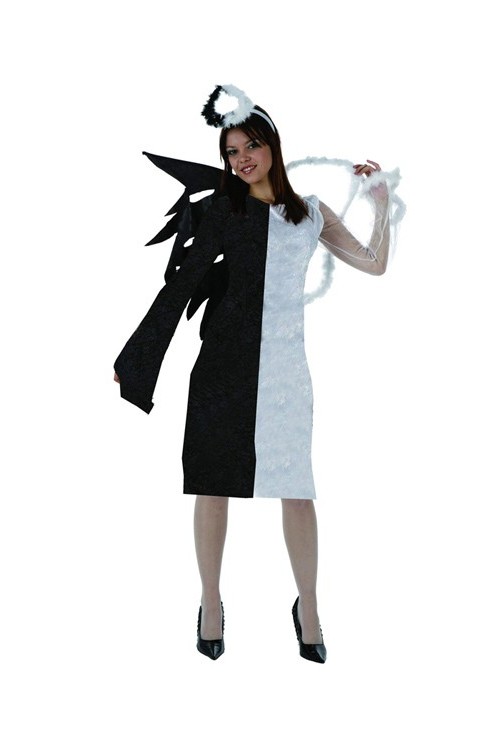Le déguisement parfait pour femme ange-démon : une jolie robe coupe droite bicolore, côté gauche blanc pour l’ange, côté droit noir pour le démon. Le côté blanc au tissu chatoyant est prolongé par une manche longue en voile blanc, avec duvet blanc tout doux aux poignets et demie aile blanche au dos. Le côté noir est prolongé par une manche longue noire évasée et une aile en tissu noir. Joli serre-tête noir et blanc pour compléter.