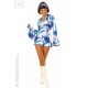 Déguisement année 70  qui comprend une robe trés colorée, avec des motiifs bariolés bleus sur fond blanc, manches évasées et un ruban accordé  à votre tenue que vous utiliserez comme serre tête. Cette tunique est tendance est psychédélique, elle sera parfaite pour les soirées déguisées.