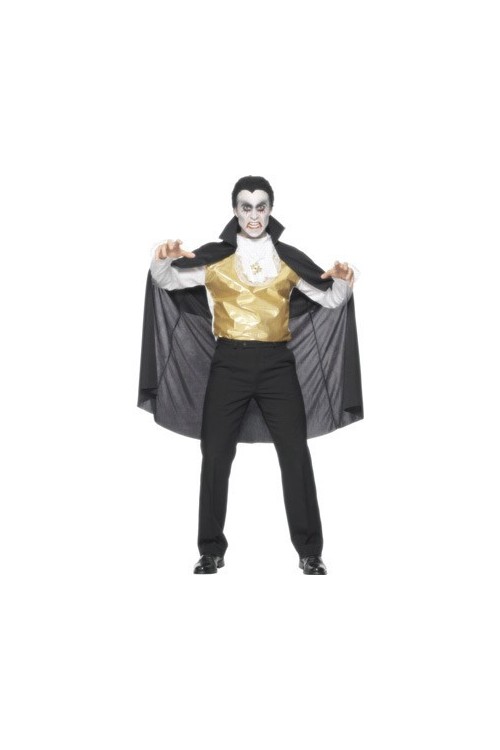 Déguisement comprenant: une cape noire avec col montant, une tunique dorée et blanche avec col en dentelle et médaillon.